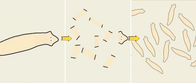 涡虫具有超级强的再生能力,有科学家曾做过实验:把一条不到2厘米长的涡虫切成279份,一周之后,每一段都能再生出一条新的涡虫出来。这种惊人的再生能力在动物界当中极其罕见。