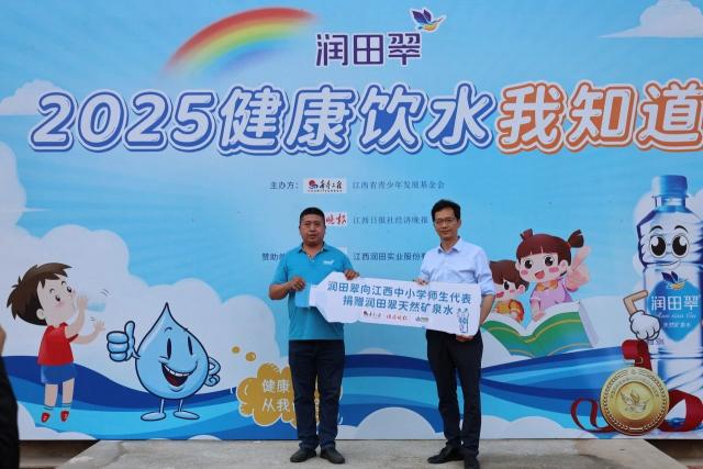 随后,江西润田实业股份有限公司向学校捐赠润田翠天然矿泉水,并与周晋仕书记合影留念。