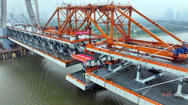 隆兴大桥位于南昌市境内,全长19公里,由北向南依次跨越赣江西支、中支和南支,是一座集高速铁路、城市快速路、城市主干道三种交通功能于一体的大跨度公铁合建桥梁。此次吊装完成的西支主桥为全线控制性工程,采用“竖琴型索面钢箱桁组合梁斜拉桥”设计,主跨320米,全长702米,共45个钢箱桁梁节段,单节最大重量达958吨。全桥钢箱桁梁总重约3.41万吨,相当于81列高速列车的总重量,其规模与施工难度均位居国内同类桥梁前列。