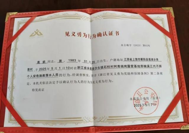 5月7日,记者最新获悉,江西鄱阳籍退役军人高武勇救落水儿童的行为已被浙江省永嘉县公安局确认为见义勇为。
