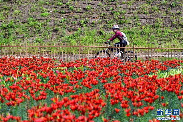 5月9日,一位骑行爱好者经过江西省宜春市万载县马步乡百合园。新华网发 邓龙华摄