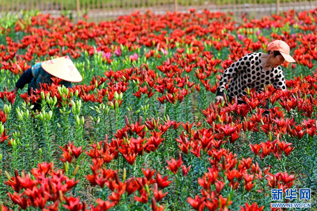 5月9日,在江西省宜春市万载县马步乡一家百合园,园林工人对彩色百合花进行除草养护作业。新华网发 邓龙华摄