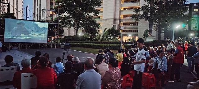 18时50分,伴随着夕阳余晖,在小区广场,居民们已早早地等候在银幕前。白幕布、放映机,穿梭嬉戏的儿童,交流谈笑的邻里,让社区夜晚格外“有声有色”。