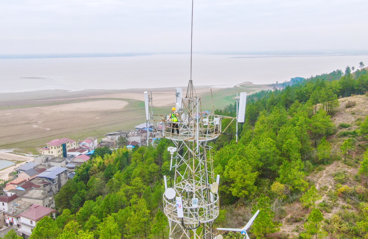 中国电信网络工程师正在鄱阳湖长山岛架设5G基站