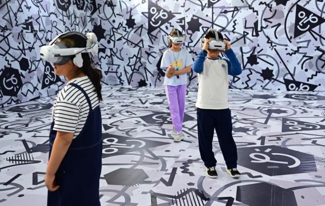 4月26日,小朋友们在第三届中国(安徽)科技创新成果转化交易会上体验VR设备。新华社记者 周牧摄