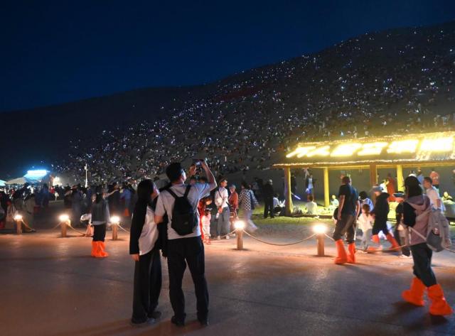 5月1日晚,游客在甘肃省敦煌市鸣沙山月牙泉景区参加万人星空演唱会。新华社发(张晓亮摄)
