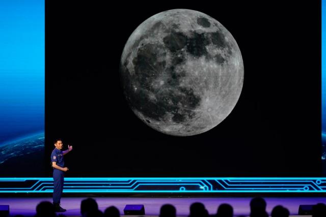 航天员叶光富在科学大讲堂上展示从中国空间站拍摄的月球。新华社记者 胥冰洁摄