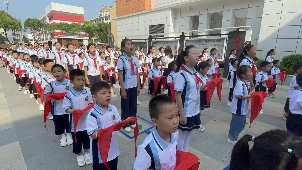 该校校长祝媛宣读新队员名单,一年级学生光荣加入少先队。老队员们为新队员郑重系上红领巾,那一刻,红领巾不仅是荣誉的象征,更承载着责任与使命。在大队辅导员曹美芳老师带领下,新队员们庄严宣誓,誓言铿锵,响彻校园,是对祖国和少先队组织最真挚的承诺。