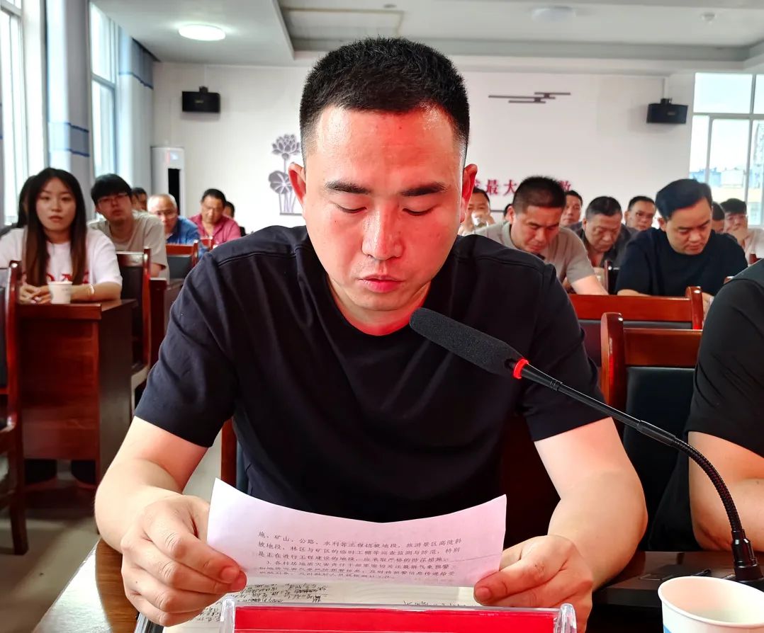 随后,党委委员、武装部长邹浩,水利站站长陈德标分别通报了全乡地质灾害和水利设施情况,并就地灾防治、塘水库巡查整治工作进行部署。各村(社区、场)党支部书记汇报了本辖区防汛筹备工作。