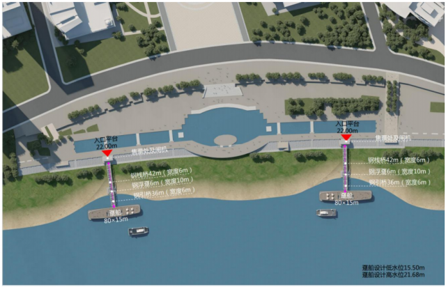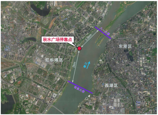 项目建设地点位于南昌市红谷滩区秋水广场,上距南昌大桥约2.0公里,下距八一大桥约1.5km。项目拟投资4033.72万元,以秋水广场东西中轴线为对称,南北各布置1处停靠点,南、北停靠点相距223米,每个停靠点分别布置2个泊位,共4个泊位。分别使用岸线118m,共使用岸线236m。设计通过能力26.80万人次/年,设计年吞吐量为18万人次,主要设计代表船型为大型游船。 工程计划于2025年7月开工,2025年12月完工,建设总工期6个月(包括施工准备期)。