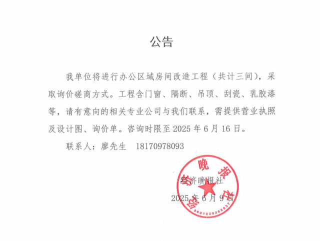 我单位将进行办公区域房间改造工程(共计三间),采取询价磋商方式。工程含门窗、隔断、吊顶、刮瓷、乳胶漆等,请有意向的相关专业公司与我们联系,需提供营业执照及设计图、询价单。咨询时限至2025年6月16日。