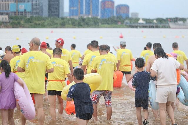 众多市民身着休闲泳装,手持游泳圈等装备,步入江水中