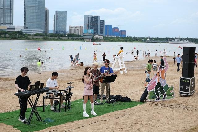 赣江“两滩七湾”天然泳场沙滩上,乐队进行现场表演