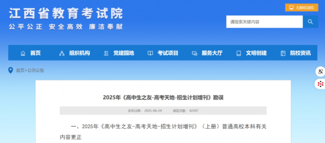 6月24日,省教育考试院网站发布消息2025年《高中生之友-高考天地-招生计划增刊》勘误,具体如下: