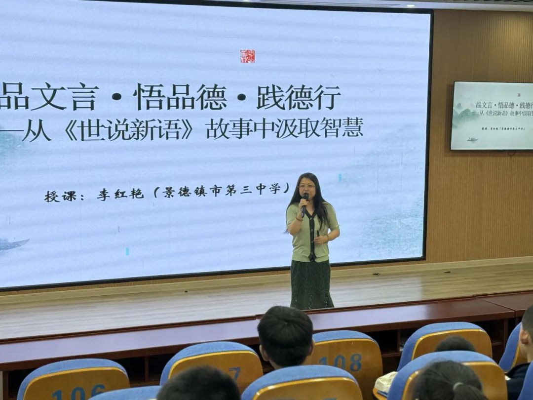 6 月18日,景德镇市第三中学李红艳老师以《从〈世说新语〉故事中汲取智慧》为题,带领学生精读文言经典,以“品文言・悟品德・践德行”为脉络,引导学生在古人智慧中感悟品德修养,让传统文化在新时代焕发新生机。