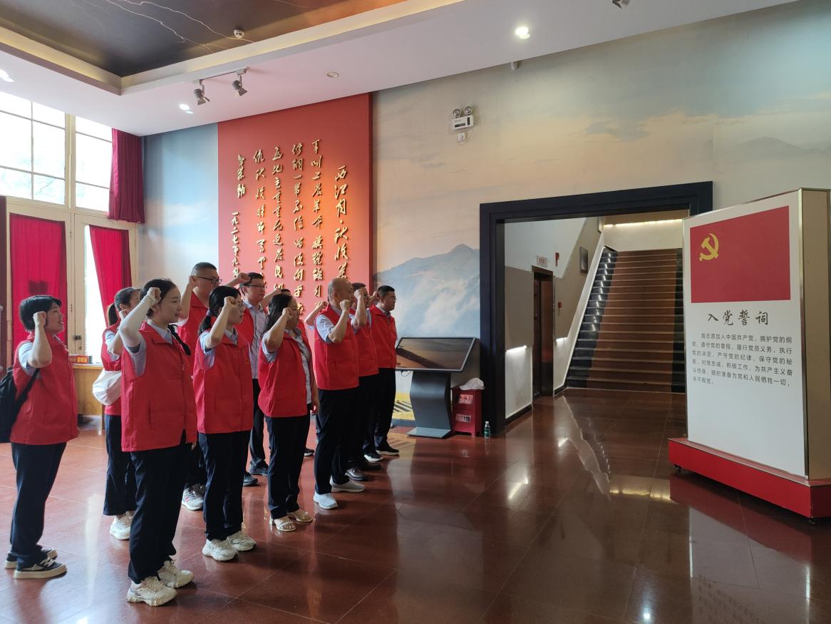 参观结束后,全体党员在纪念馆内,面对鲜红的党旗,庄严宣誓,重温入党誓词。