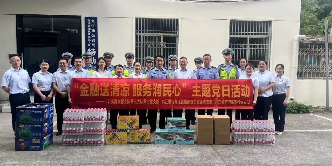 炎炎夏日,九江市公安局交管支队第三大队特勤中队为市民守护46.5公里的道路通畅。7月9日,九江银行九江管理部机关联合党支部、九江银行浔东支行党支部携手九江市公安局交管支队第三大队第七党支部,为一线执勤交警发放防暑降温物资,同时围绕“防范电信网络诈骗”“远离非法集资”“个人信息保护”等金融知识开展宣传,并现场解答交警关于金融理财、资金安全等方面的疑问。