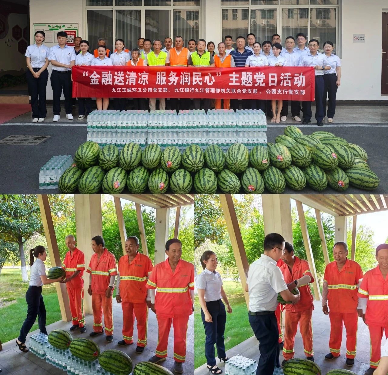 九江玉诚公司600余名环卫工人在高温下坚守岗位,守护八里湖新区10万余居民的环境健康。7月8日,九江银行九江管理部机关联合党支部、九江银行公园支行党支部携手九江玉诚环卫公司党支部,为这群城市守护者送上矿泉水、西瓜等防暑降温物资,感谢他们为创建干净、整洁、舒适的城市环境付出的辛勤劳动。