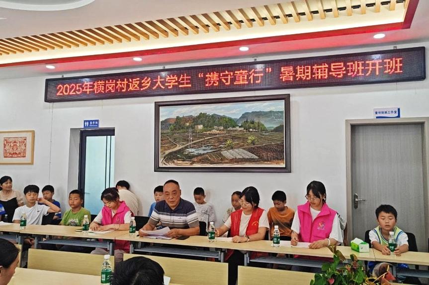 “这个方程组我终于弄懂了!”横岗村新时代文明实践站内,14名返乡大学生正以“邻家老师”身份,为孩子们定制“暑期知识套餐”。从作业辅导到科学实验,从安全自护到趣味阅读,这群“00后”教师用青春活力点燃学习热情。“往年孩子只能看电视打发时间,现在天天催着来上课!”村民李大姐的感慨,道出了40余个家庭的心声。横岗村“携守童行”暑期辅导陪伴活动已经开展多年,这场双向奔赴的实践,既解决了留守儿童“看护难”,也为大学生搭建了服务家乡的舞台。