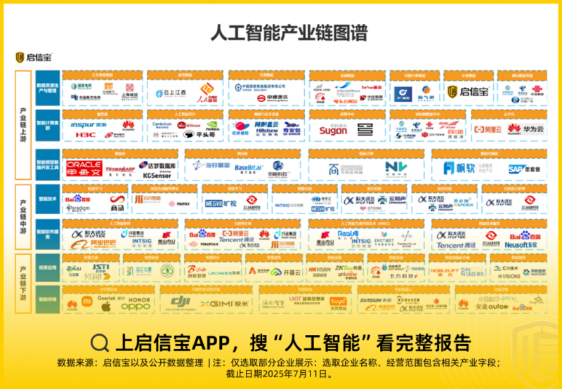 中国AI产业已从2023年的“百模大战”迈向“应用为王”阶段,技术价值通过实际场景落地加速释放。启信宝产业链图谱揭示,中国AI生态形成了紧密协作体系。上游,运营商与云巨头提供算力基石,海天瑞声、人民数据、启信宝等数据服务商提供高质量数据;中游,“通义”“混元”“盘古”等大模型成为发展引擎;下游,小米、大疆等企业将AI能力融入终端产品与行业解决方案,共同推动AI商业化落地。