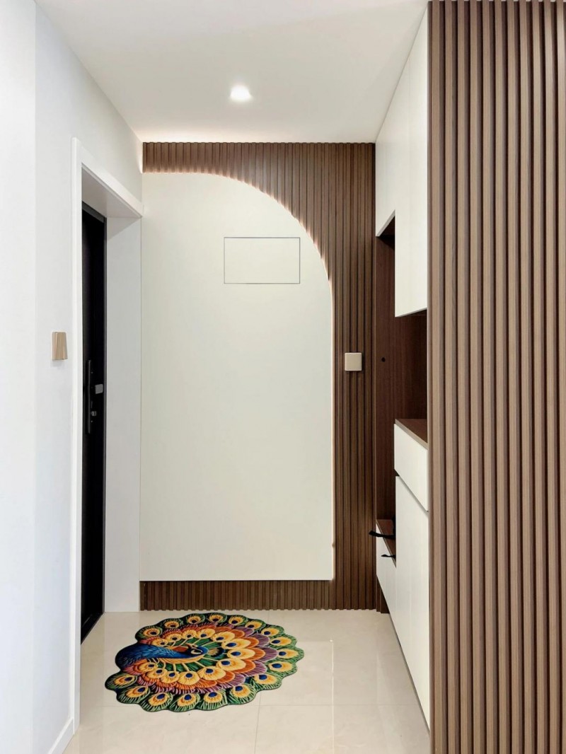 玄关以条纹木饰面呼应自然肌理,白木拼色的玄关柜遵循“藏八露二”原则,兼顾收纳与审美。客厅与阳台相连,形成光线与动线的系统性优化:琥珀色沙发作为视觉重心,奶白色地砖中和压抑感,姜黄色窗帘衔接冷暖色调,构成“Z”字形视觉动线。电视机内嵌背景墙的“画框效应”,巧妙营造出“伪横厅”的开阔感;阳台则融合家政与休闲功能,将洗衣-晾晒-收纳动线简化为直线路径。