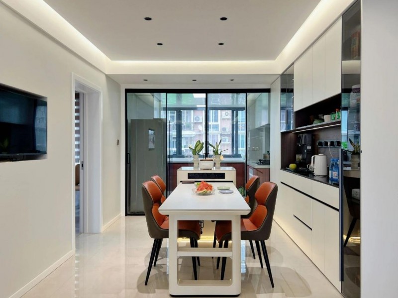餐厅与厨房以玻璃移门相隔,既保持开放感又明确功能界限。靠墙定制的收纳柜“有藏有露”,开放格展示咖啡器具,封闭柜收纳杂物。岛台与餐桌的白色系设计,强化了从烹饪到用餐的仪式感。厨房采用3:7的色彩配比,烟红色下柜唤醒食欲,占比70%的奶白色基底则弱化空间压迫感,让小厨房更显宽敞。