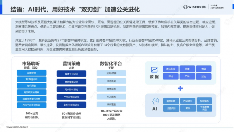 洞察到这一趋势,慧科讯业Wisers发布《2025年AI时代公关白皮书》,在白皮书中对2025年AI相关代表性的公关事件进行回顾与总结,为企业理性应对AI相关事件提供参考。同时,揭示AI如何赋能危机公关从被动响应升级为主动洞察、精准决策、高效修复,并提供可落地的策略框架,帮助企业更好地把握危机处理的关键,转危机为契机。