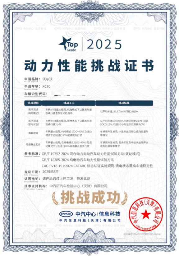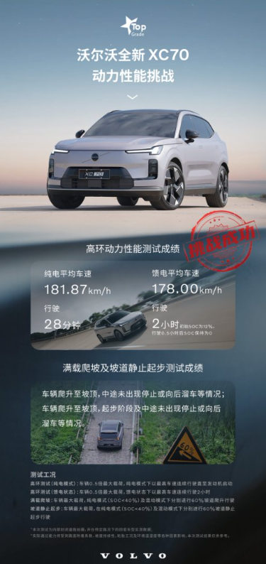 当新能源车型成为家庭远途出行的主力,消费者对混动车型的期待早已不止于“省油”,而是全场景下“动力不打折、极端不掉链”的可靠表现。作为豪华超混领域的开拓者,沃尔沃全新XC70近日通过了国内权威检测机构中汽中心的严苛动力测试,以“纯电高速稳、馈电动力足、陡坡轻松爬”的硬核成绩,验证了其SMA超级混动架构的技术实力,为豪华混动车型树立了动力性能新标杆。