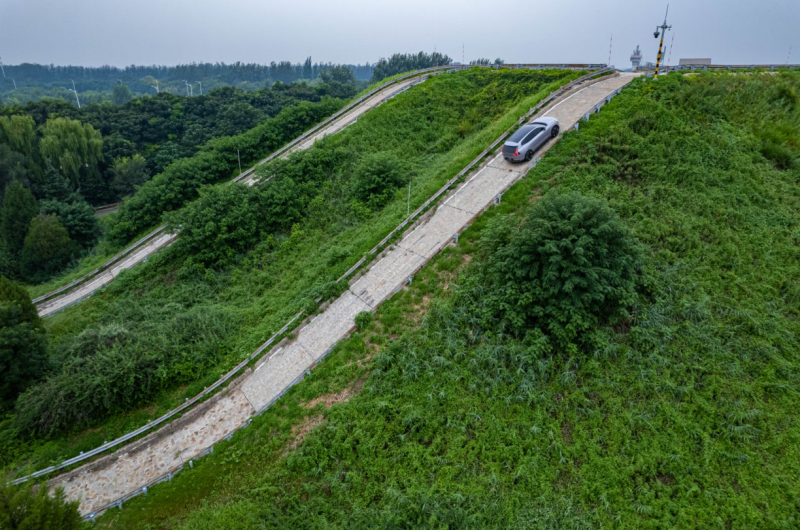 测试按照车辆最大允许总质量进行满载准备,在混动模式与纯电模式下分别挑战60%陡坡攀爬。要知道,常见地下停车场的坡度仅为15%左右,60%的坡度相当于日常场景的4-5倍,对车辆扭矩输出、动力分配与车身控制的要求呈指数级提升。实测中,XC70无论是从坡底平稳起步,还是在坡道中间静止重启,全程均未出现溜车、动力中断等问题,甚至无须深踩油门就能稳健登顶,动力输出细腻且持续。