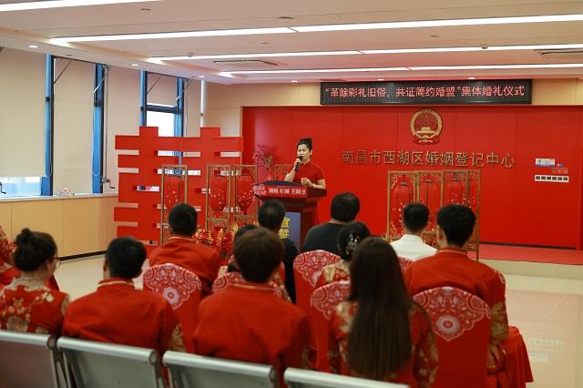 8月29日是农历七夕佳节,南昌市西湖区婚姻登记中心举办了一场以“革除彩礼旧俗,共证简约婚盟”为主题的中式集体婚礼。婚礼现场,新人们身着传统中式礼服,依次进行携手走红毯、行拜礼、集体宣誓等仪式。