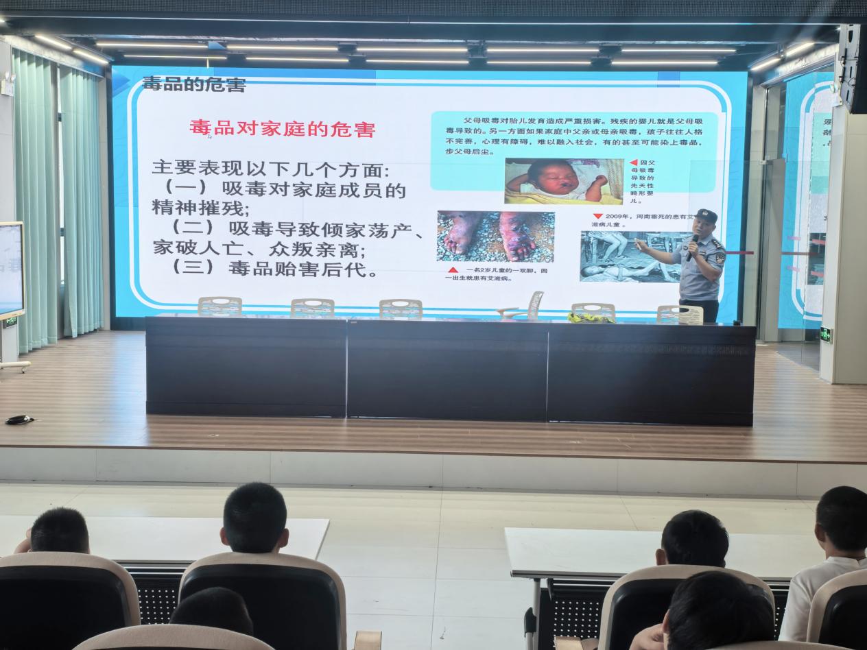 禁毒知识教育环节,周警官向学生介绍了毒品的种类、危害及防范措施,强调了毒品对个人、家庭和社会的巨大破坏力,教育学生坚决抵制毒品诱惑,提高识毒、防毒、拒毒的能力,珍爱生命,远离毒品。