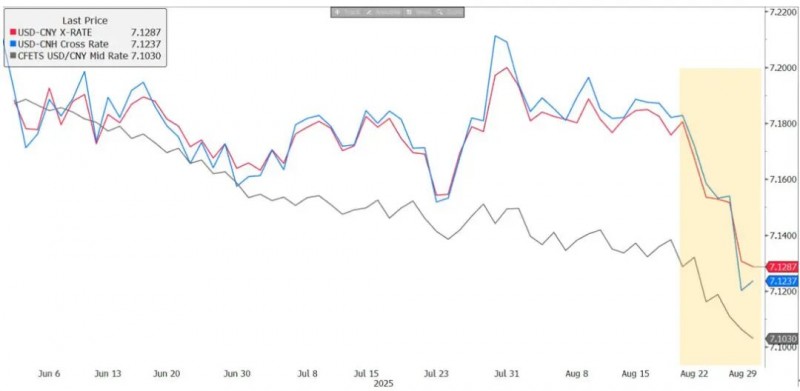 一是人民币中间价不断下调,创下去年11月以来的最低点。8月29日,人民币中间价已下调至7.1030,相比前一交易日的7.1063继续下降,该中间价水平创下了去年11月以来的最低点。自4月对等关税以来,央行