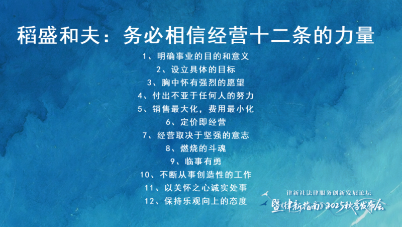 “社会终将回报那些疯狂为社会创造长期价值的人,”他引用稻盛和夫的经营十二条勉励在场嘉宾,“唯有以利他之心做事,保持燃烧的斗魂,不断从事创造性工作,才能在逆境中实现超越。”