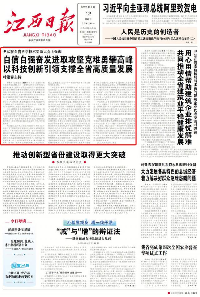 9月11日,全省科学技术奖励大会在南昌召开。省委书记尹弘出席并讲话,他强调,要深入贯彻习近平总书记关于科技创新的重要论述和考察江西重要讲话精神,大力实施科教强省战略,自信自强、奋发进取,攻坚克难、勇攀高峰,全面提升科技创新能力,推进科技创新与产业创新深度融合,切实以科技创新引领支撑全省高质量发展。