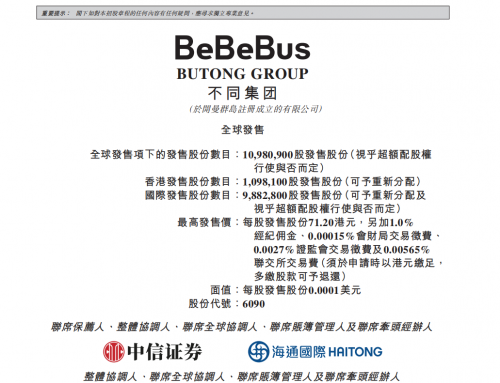 根据招股安排,不同集团将于9月15日至9月18日公开招股,发行价区间为62.01-71.20港元/股,每手入场约7191.8港元,市值预计介于56.27亿至64.61亿港元,并计划于9月23日正式挂牌上市。BeBeBus在本次发行中,共引入三名基石投资者——信庭基金、华泰资本最终投资客户和GreatPraise分别认购500万美元。此前,BeBeBus还已获得天图投资、高榕创投、经纬创投和泰康人寿的投资。