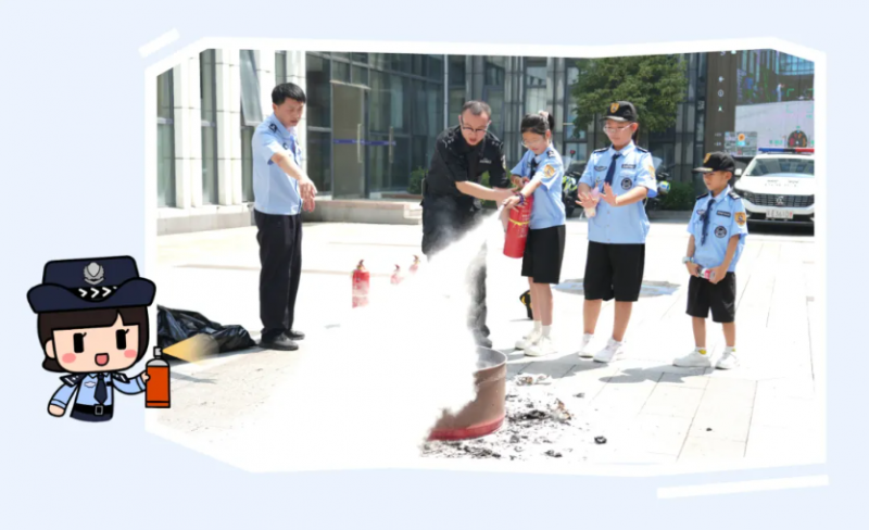 警察叔叔们将各类消防器材一一展示,耐心讲解灭火器、防火毯的使用方法。在专业的指导下,几位孩子还亲手拿起灭火器,模拟扑灭初起火灾,完成了成为“小小守护者”的安全技能考核。