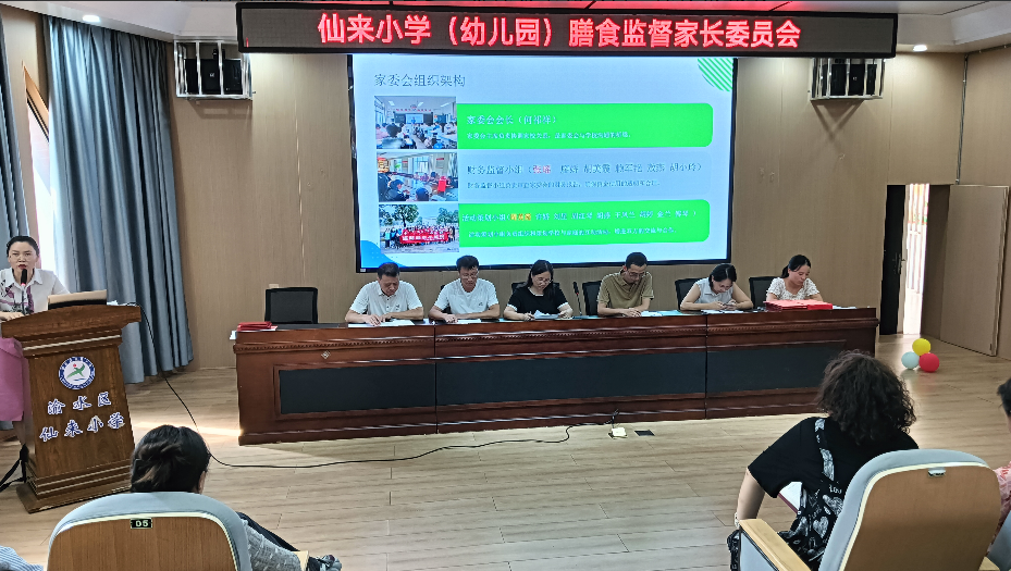 会议首先由德育处主任龚晓丽宣读《仙来小学家长委员会章程》,副主任胡慧玲就校家社协同育人建设情况作简要介绍,强调健全章程和评价体系对家校合作的重要性。接着,各相关部门依次汇报工作:安全副校长章忠华介绍校园安全管理及相关制度;工会主席张瑜介绍教学工作;食堂负责人副校长胡小猫阐述食品安全工作;仙来办中心幼儿园园长黄琴介绍幼儿园办学理念和师资队伍;幼儿园后勤主任分享科学制定营养食谱的经验。校级家委会会长何祁祥发言,引发家长们热烈响应,大家积极为孩子成长建言献策。随后,校领导为廖娇等新增校级家委会成员和李云等膳食监督委员会成员颁发聘任证书。最后,学校党支部书记、校长肖莲青介绍学校办学思想、成果及未来规划,为家校合作指明方向。