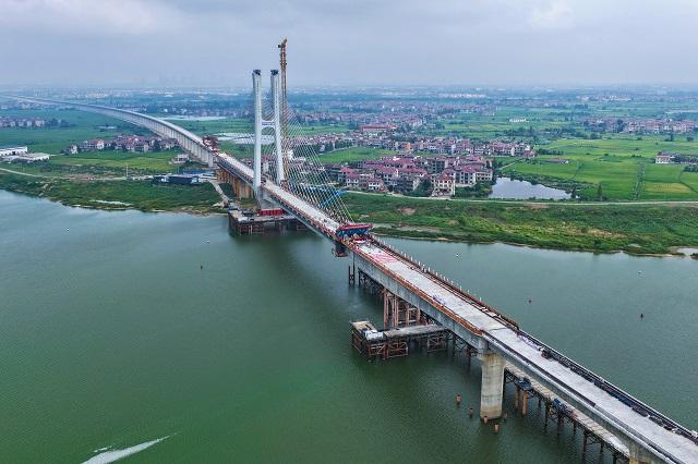 昌九高铁南昌扬子洲赣江公铁大桥,是一座集高铁、城市快速路等14条通道于一体的大型工程,全长19公里,跨越赣江三条支流,设西支、中支、南支三座主桥,包含双塔双层斜拉桥、单塔单层斜拉桥、双层连续梁桥三种桥型,工程建设创造了多项世界纪录。其中,中支、西支主桥已分别于今年1月、5月完成合龙。