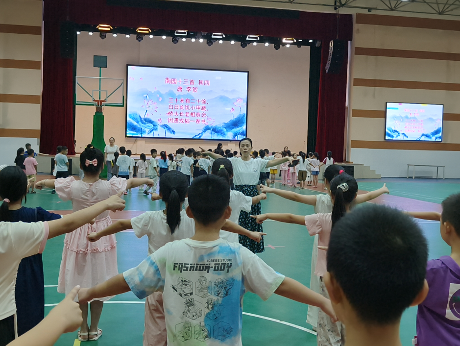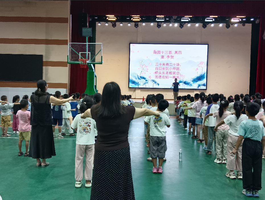 早上7:05,晨光洒满校园,志愿者教师、家长与“诗润童心”学子齐聚,吟诵培训之旅正式开启。活动特邀江西省非物质文化遗产“楚调唐音”传人黄谦工作室的邹永平老师授课。他以李贺《南园十三首·其四》为载体,先讲解“三十未有二十余”的少年心境与时代背景,再示范“平长仄短、平高仄低”的吟诵技巧,声调或悠扬或铿锵,以声传情助孩子们代入情境。他还耐心纠正发音节奏,教学专业又富童趣,获现场喝彩。邹老师指导后,教师按年级分组带孩子们练习,从单人试读到小组齐诵,再到上台展示,孩子们踊跃参与。操场上,稚嫩且饱含情感的吟诵声此起彼伏,师生沉浸在古典诗词韵味中,陶醉于非遗吟诵魅力,笑脸满是对传统文化的热爱。