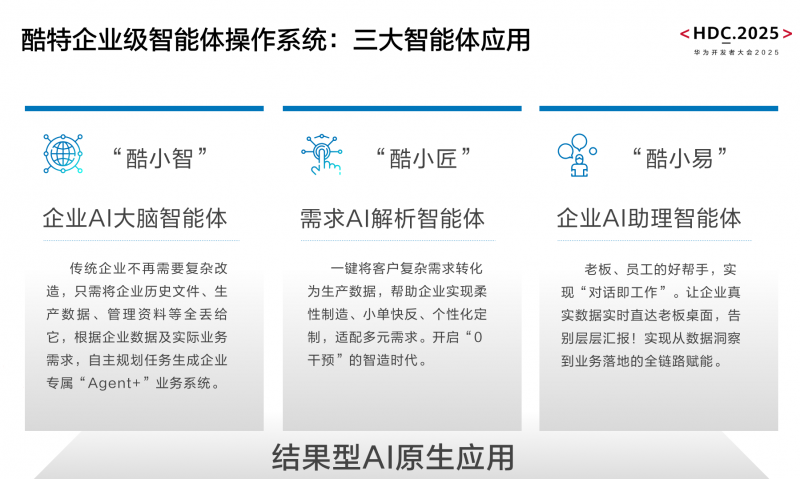 2025年6月,在华为HDC2025开发者大会上,酷特智能发布了“酷小智”“酷小匠”“酷小易”三款全新酷特AIAgent企业级通用智能体应用,为企业打通数智化转型“最后一公里”提供解决方案。
