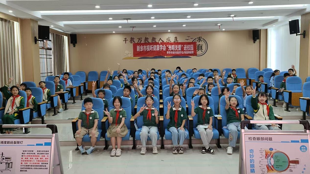 多媒体会议室内,新余市视听健康学会“光明关爱”团队带来知识盛宴。汪晓讲师将睫状肌调节原理转化为“眼睛做体操”的趣味解说,孩子们惊叹:“原来眨眼次数减少,眼睛也会‘口渴’!”互动环节中,同学们踊跃竞答护眼知识,现场气氛热烈。