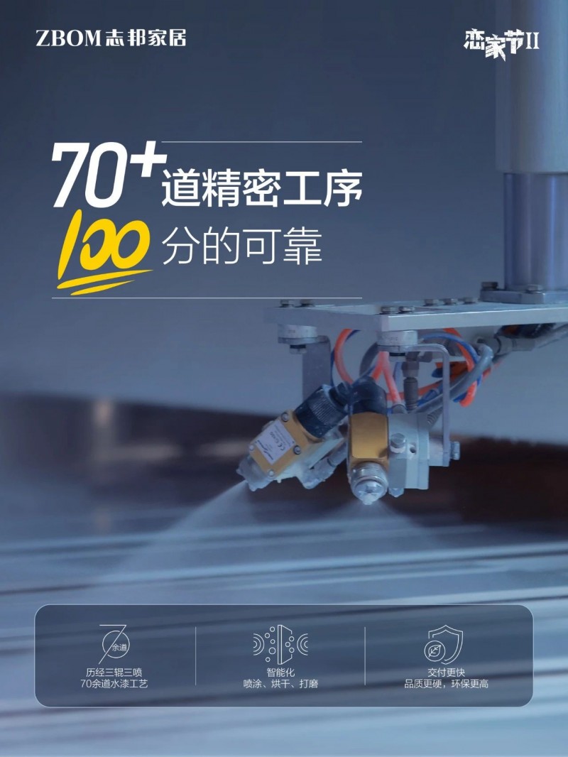 卓越的性能源于精细化的工艺支撑。ZBOM志邦家居欧松水漆板历经70余道精密工序打磨,采用“三辊三喷”智能化生产流程,通过自动化喷涂、烘干与打磨技术,既保证了工艺的一致性与稳定性,又提升了交付效率。