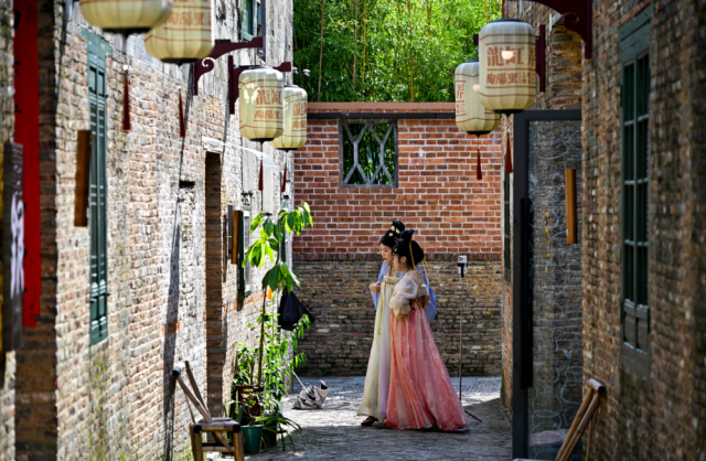 年轻游客在江西省景德镇市陶阳里历史文化街区游览。新华社记者刘金海摄