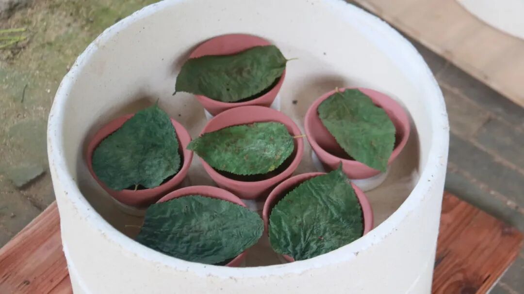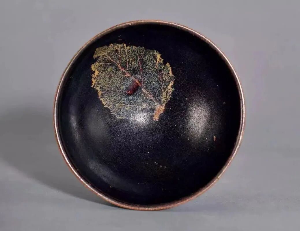 这是吉州窑独有的木叶盏,釉色依然透着神奇的辉光。盏里的桑叶,似是刚从树上飘下,一阵风吹,落在了碗里。事实上,或真就是这样,激发起了窑工的好奇心,于是有了大胆的设想,要把生活留在艺术的淬炼里。置入清水,感觉叶子浮动起来,如一叶扁舟。有的桑叶上,还留有一个个小虫眼。
