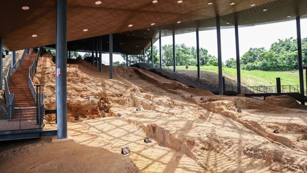 这座龙窑,是宋代的窑床,元代的窑壁,一代代叠压着,竟然叠压着三层窑。元代道路遗址上面,是明代道路遗址,道路两边有水道,中间走独轮车,车辙的痕迹依然。小路从十五度到三十度,繁忙时车轮飞转,热火朝天。