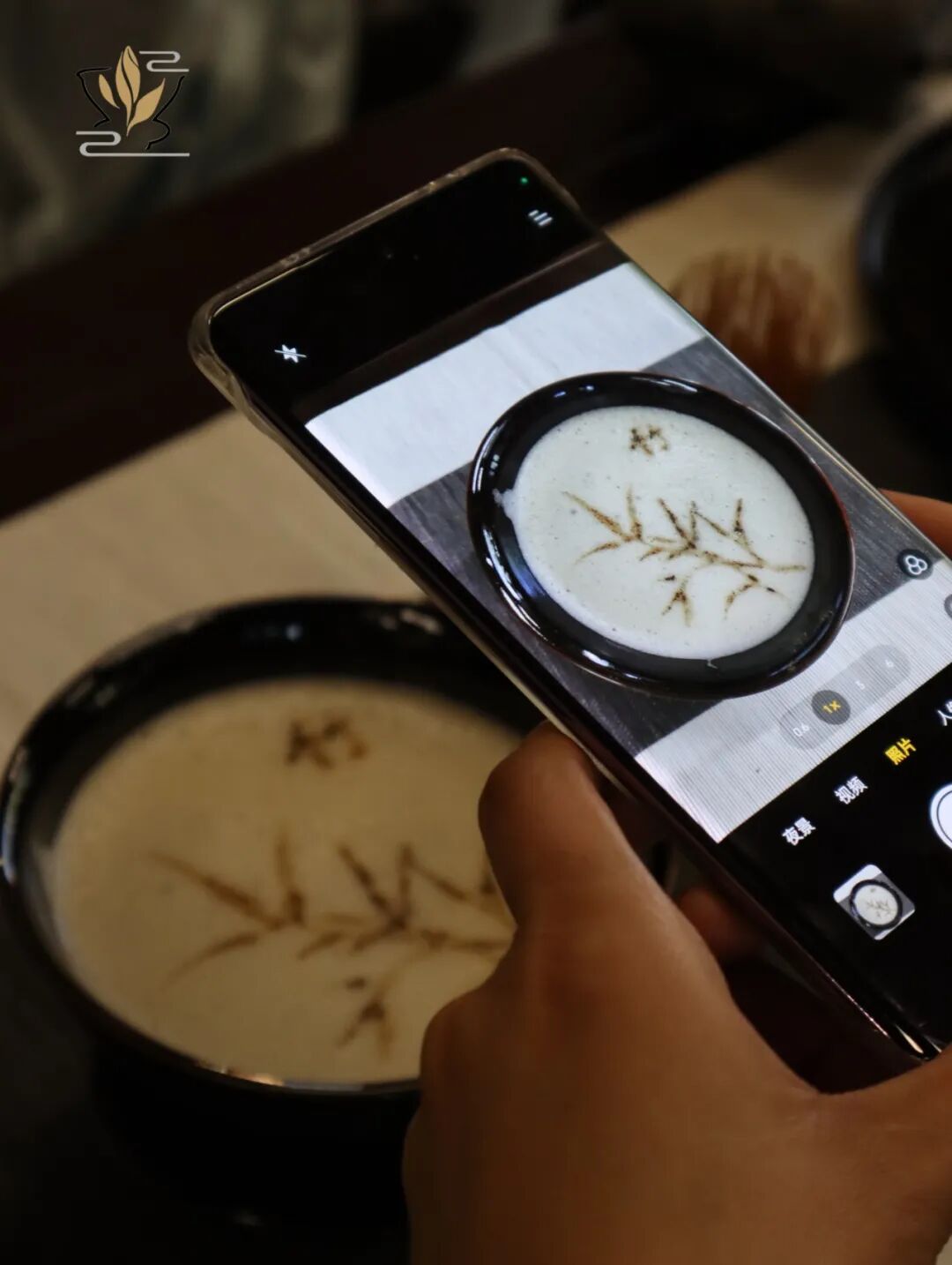 将茶粉放在黑釉盏里,注入少量沸水调成糊状,再注入沸水,用茶筅搅动,茶沫上浮,形成粥面,而后认真地在上面写字、作画。