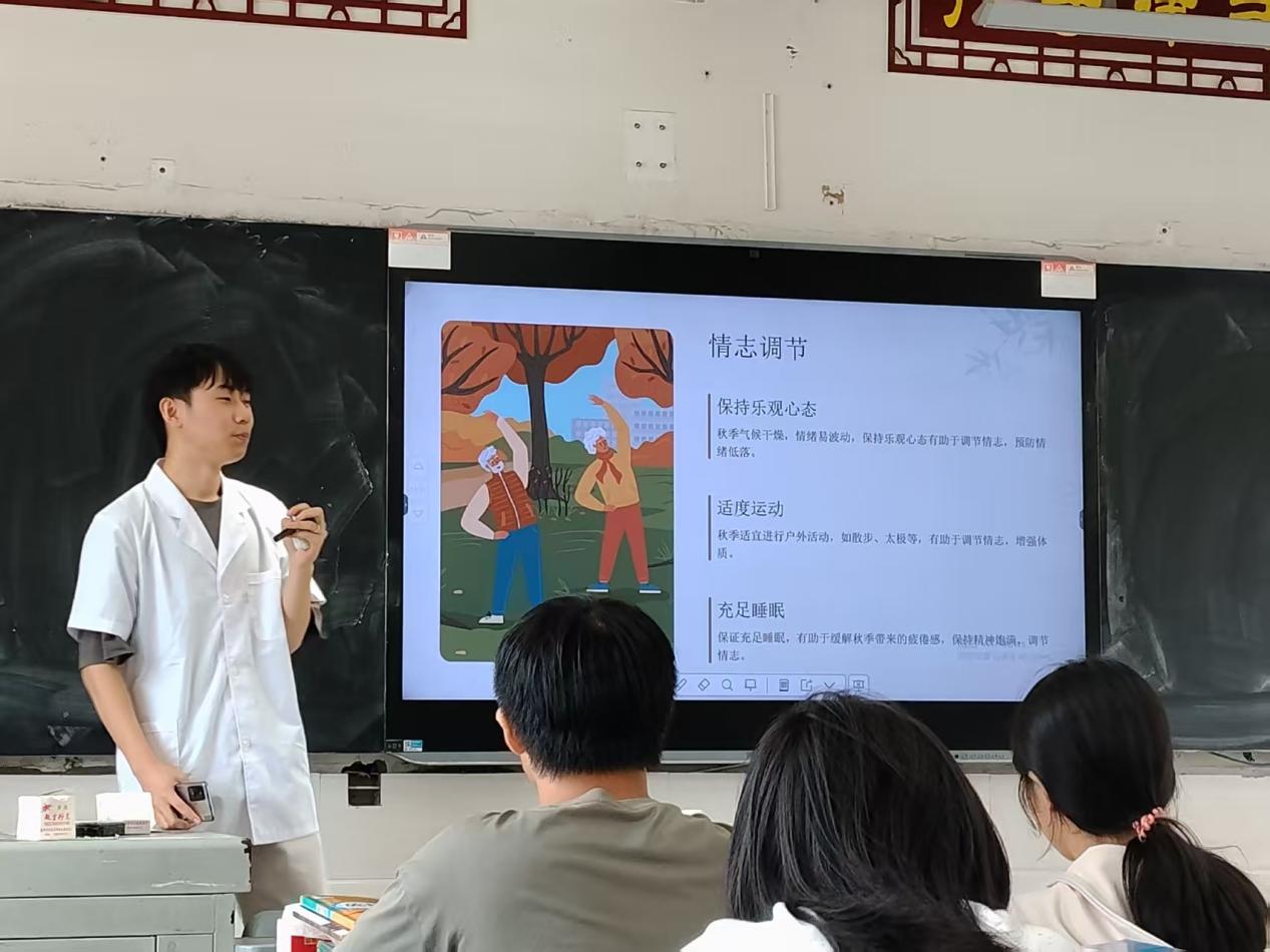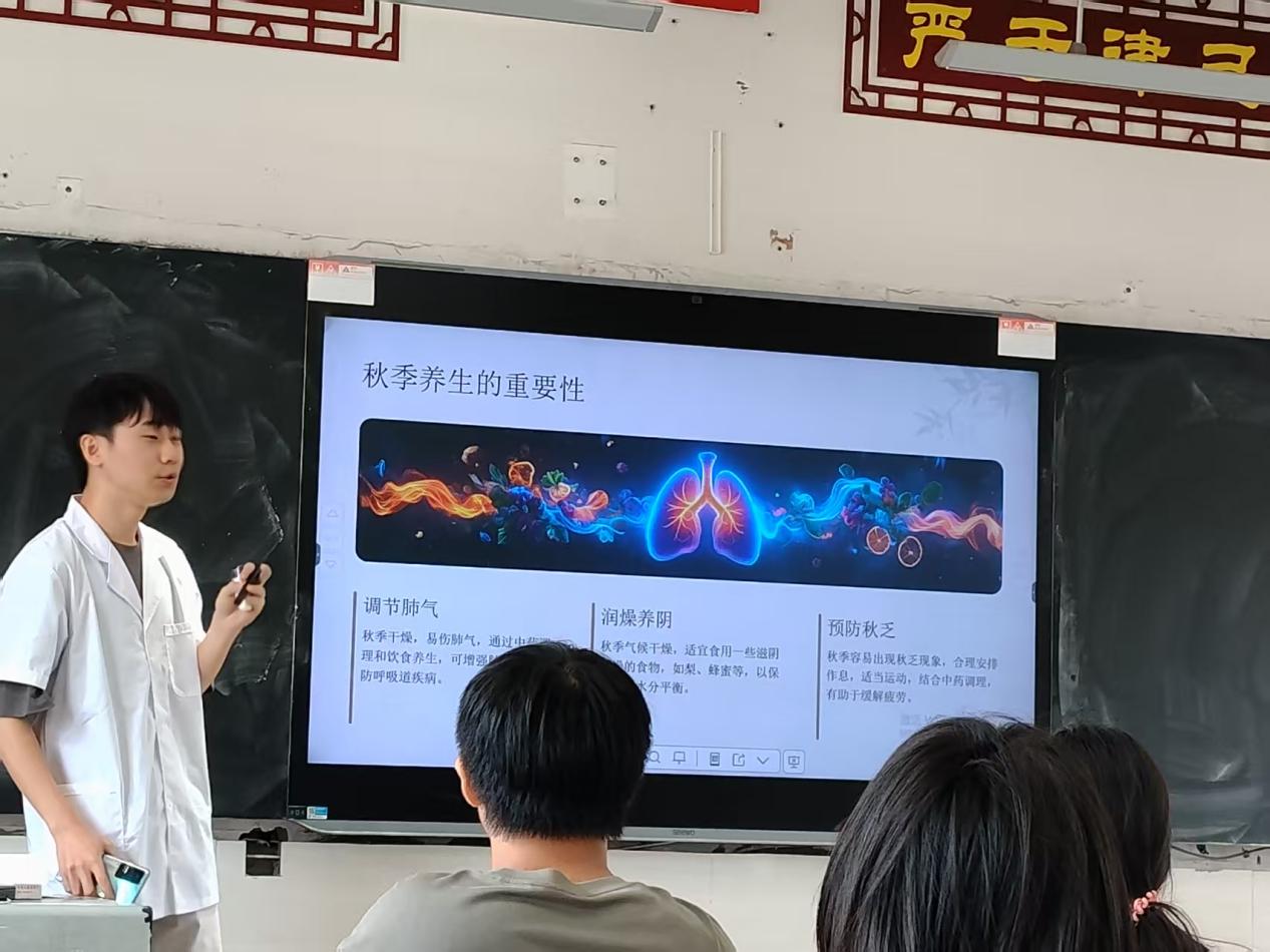 主讲人从中医“天人相应”理论入手,生动阐述了秋季养生的重要性,强调“秋冬养阴”的根本原则,使师生深刻理解顺应自然规律的必要性;随后,团队系统讲解了秋季起居调摄要点,包括饮食上多食梨、银耳等以滋阴润肺,起居上倡导“早卧早起”并注意保暖防燥,以及环境上保持空气湿润等具体方法;同时,针对秋季易发的“悲秋”情绪,普及了情志调节知识,通过分析情志与健康的关系,鼓励户外运动、保持乐观心态等,以达到安神定志、舒畅的目的。