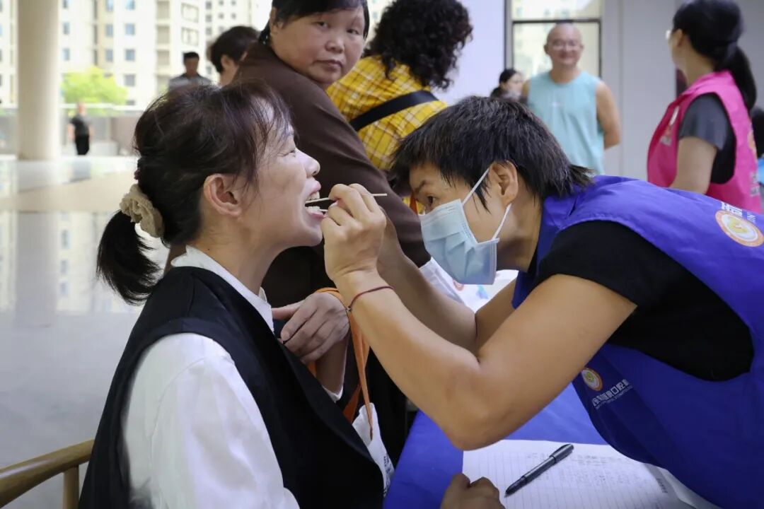 在义诊区域,居民们正与医生面对面交流,不仅咨询口腔健康问题,也诉说着日常遇到的口腔困扰。医生们则逐一耐心解答,细致检查居民口腔状况,有针对性地给出治疗建议与护齿方案,将健康关怀切实送到大家身边。活动现场,志愿者还向参与活动的居民普及垃圾分类知识。