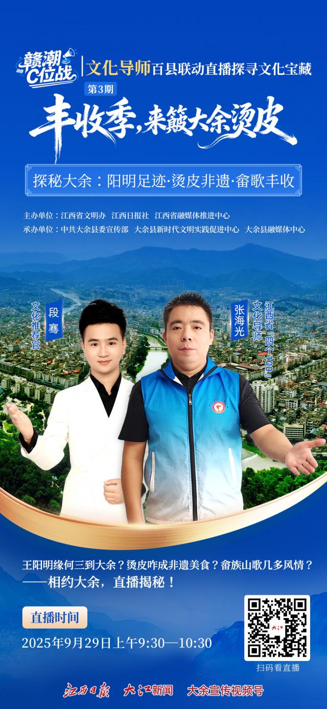 9月29日上午9:30—10:30,“赣潮C位战”丨文化导师百县联动直播活动第三站将循着文脉与丰收气息,走进这座千年古城。江西省“四个100”文化导师将化身“文化探宝人”,追溯王阳明与大余的不解之缘,探寻“此心光明”的精神印记;驻足非遗工坊,见证大余烫皮从米浆到酥脆的全手工制作,品味舌尖上的千年技艺;聆听畲族山歌的嘹亮腔调,感受少数民族文化与客家风情的交融;更有抓鸭抓猪、“混战黄金圈”等趣味互动,沉浸式体验丰收季的热闹欢腾。