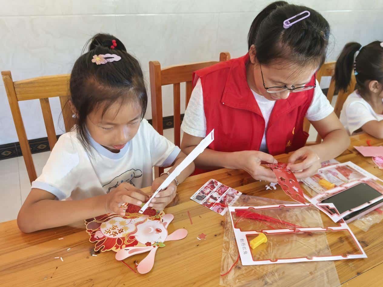 手工制作环节是孩子们最期待的“重头戏”。实践员提前准备好彩纸、竹篾、灯穗、胶水等材料,手把手教孩子们搭建花灯骨架、粘贴灯面、装饰流苏。“这里要折出弧度才好看”“灯穗要留长一点,风吹起来才灵动”,实践员耐心指导每一个细节,孩子们互帮互助,有的专注裁剪,有的细心粘贴,不一会儿,一盏盏造型各异的兔子灯、月亮灯便“点亮”了桌面,孩子们捧着自己的作品,脸上洋溢着成就感。